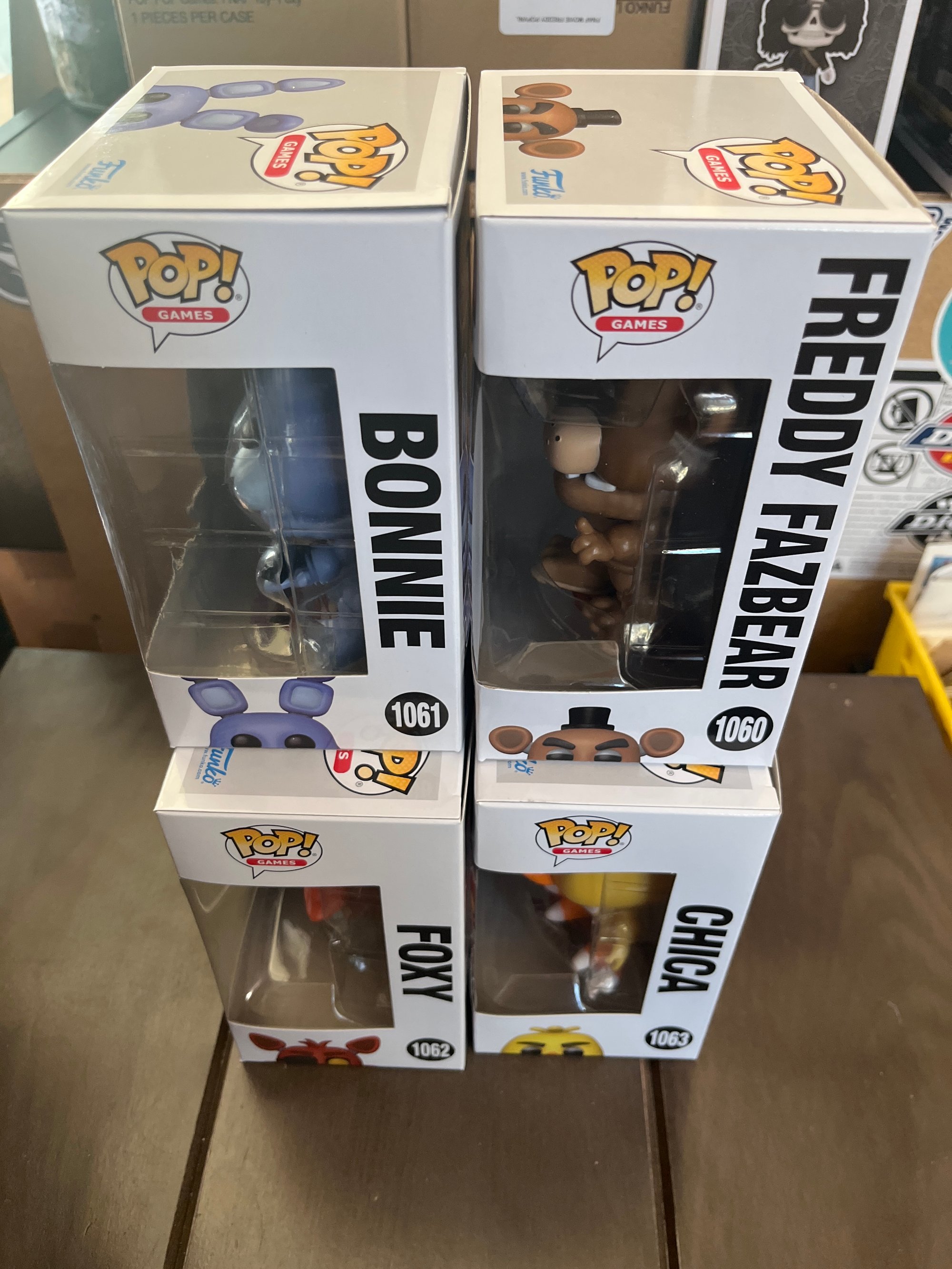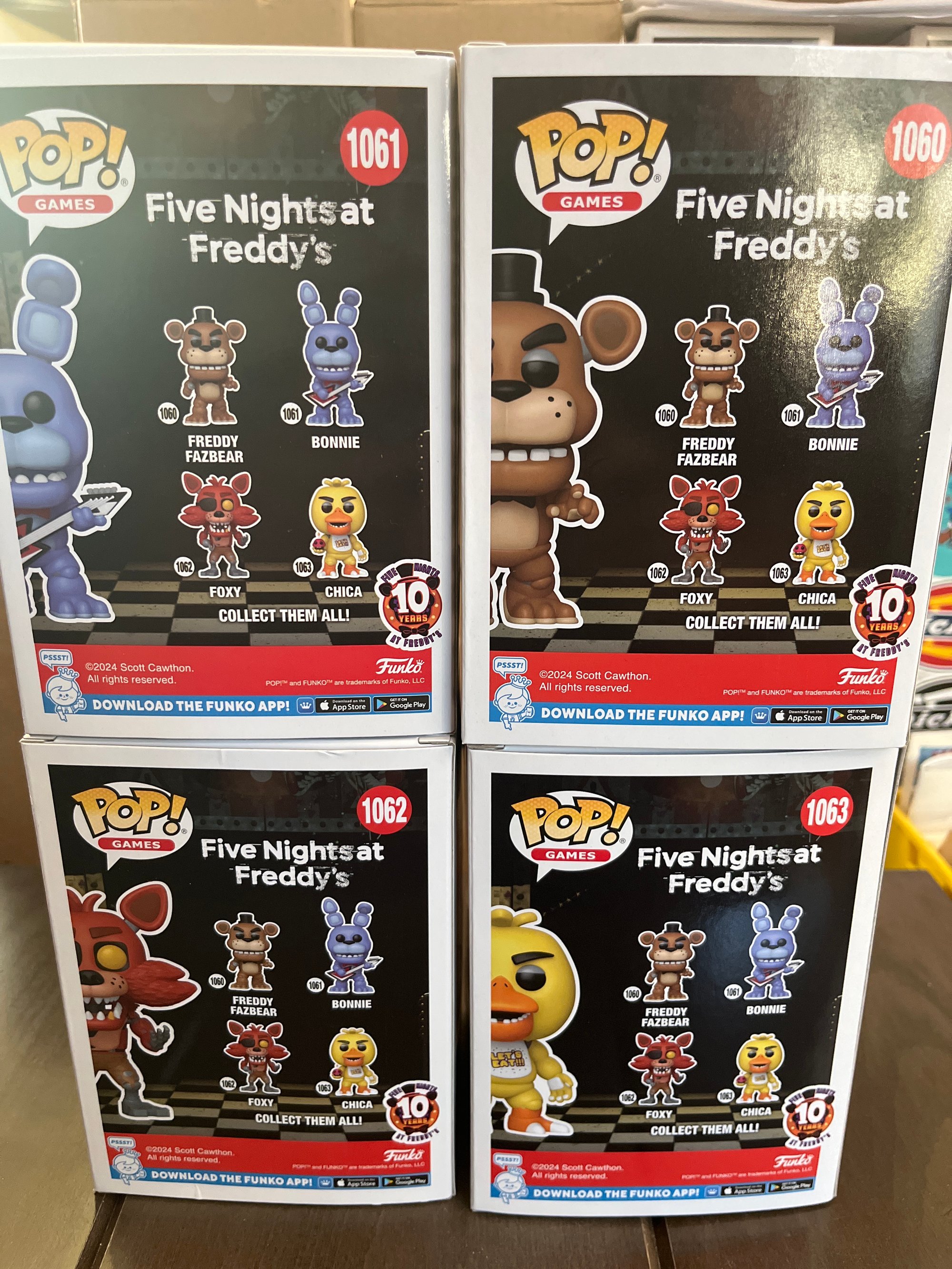 Pop! Game five Nights at Freddy’s 10th Anniversary Lot : Freddy fazberar , Bonnie , Foxy and Chica vinyl figures…..